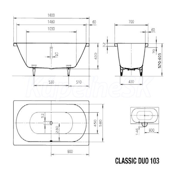 Kaldewei CLASSIC DUO 103 1600x700x420 Obdĺžnikové vane Kaldewei BW CLASSIC DUO 103, 1600x700x420 AS, alpská biela, P