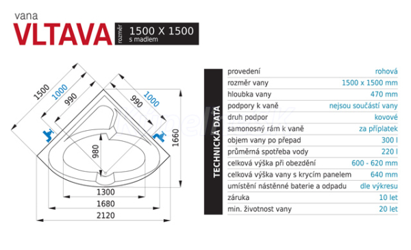 Akrylátová vaňa Vltava patrí do série rohových vaní a je mimoriadne priestranná. Medzi rohovými vaňami na súčasnom trhu poskytuje najväčší vnútorný priestor. Jej priestor je veľký natoľko, že poskytne pohodlnú kúpeľ aj pre rodinu s deťmi. Súčasťou akrylátové vane je i nerezové madlo, ktoré Vám uľahčia vstup a výstup z vane.