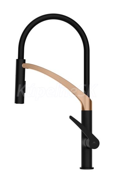 Drezová vodovodná batéria ULTIMA U-50 ktorá je celá v modernej čiernej - ružovo zlatej farbe s vysokým flexibilným masívnym ramenom, ktoré je v ružovo zlatej farbe, s hadicou a nastaviteľnou spŕškou opäť v čiernej farbe. ULTIMA U-50 v mnohom prekračuje strednú kategóriu, do ktorej sa radí svojou priaznivou cenou. Batéria je moderne designovaná.