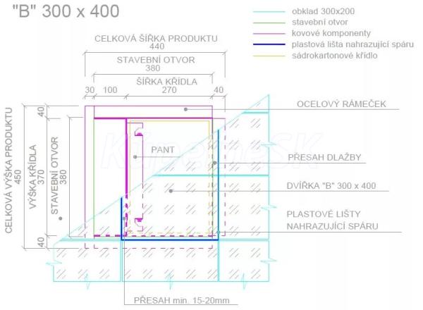 Pozor! Stavebný otvor do ktorého osadíte dvierka, musí byť min. o 15 cm širšíí. Napr. dvierka rozmeru 50 x 60 cm (rozmer dvierok určíte podľa veľkosti použitého obkladu - v tomto prípade obklad 25x30 - dve na šírku a dve na výšku). Takéto dvierka osadíte do pripraveného otvoru min. šírka 65 x výška 60 cm.