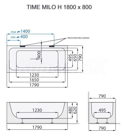 Voľne stojaca vaňa TIME MILO - H sa vyznačuje geometrickým hranatým vonkajším tvarom a je vhodná pre umiestnenie k stene. Plynulý priebeh línií s mäkko zakriveným vnútorným priestorom vytvára prirodzený kúpacie priestor bez zbytočného plytvania vodou. Pri navrhovaní kúpeľne nie ste nijako obmedzení, máte na výber z troch rozmerových variantov.