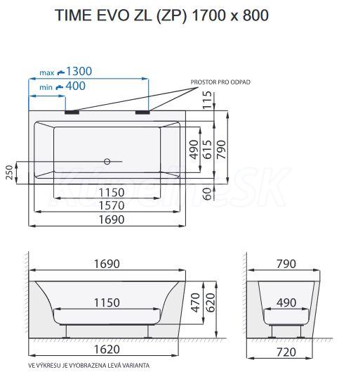 Voľne stojaca vaňa TIME EVO - ZL (ZP) má z dvoch strán zošikmené boky a tretia strana je kolmá pre bezproblémové umiestnenie vane do rohu. Mimoriadne široký okraj vane poskytne projektantom maximálnu voľnosť v plánovaní kúpeľne, pretože armatúry a príslušenstvo je možné variabilne umiestniť na okraj vane. Širší lem možno využiť taktiež na odloženie hygienických potrieb. Vaňa je určená pre umiestnenie do rohu.