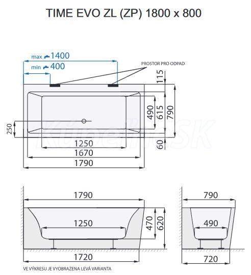 Voľne stojaca vaňa TIME EVO - ZL (ZP) má z dvoch strán zošikmené boky a tretia strana je kolmá pre bezproblémové umiestnenie vane do rohu. Mimoriadne široký okraj vane poskytne projektantom maximálnu voľnosť v plánovaní kúpeľne, pretože armatúry a príslušenstvo je možné variabilne umiestniť na okraj vane. Širší lem možno využiť taktiež na odloženie hygienických potrieb. Vaňa je určená pre umiestnenie do rohu.