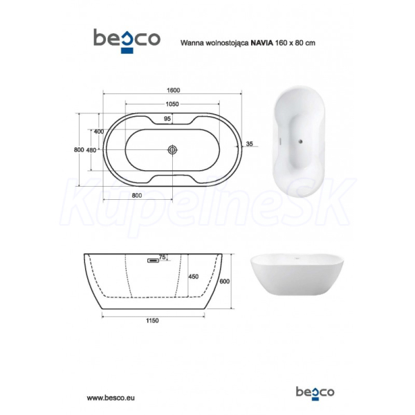 Besco NAVIA voľne stojaca akrylátová vaňa 160x80 cm,235L,Biela,sifón click-clack Biely