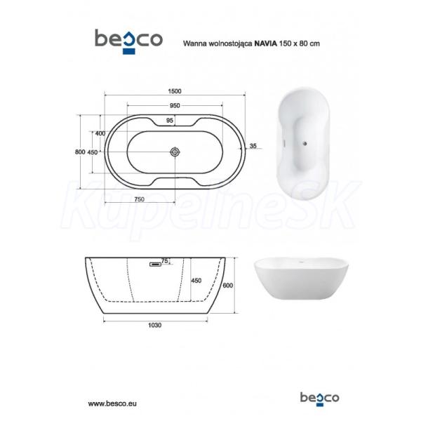 Besco NAVIA voľne stojaca akrylátová vaňa 150x80 cm,210L,Biela,sifón click-clack Grafitový