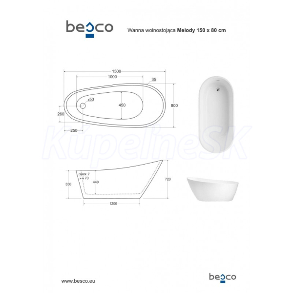 Besco MELODY Glam voľne stojaca akrylátová vaňa 150x80 cm,Zlatá,sifón click-clack Biely