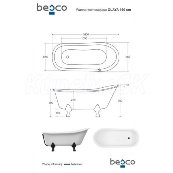 Besco OLAYA voľne stojaca oválna akrylátová retro vaňa 160x68 cm 170 L,Biela,nožičky Chróm