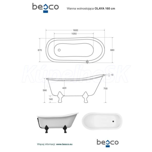 Symetricky oválna voľne stojaca retro vaňa OLAYA v bielej farbe sa vyrába s kovovými ozdobnými nohami v štyroch farebných variantoch ( chróm, čierna, biela a zlatá farba) . Krásna masívna vaňa z prvotriedneho sanitárneho kompozitu (akrylátu). Konštrukcia vane nevyžaduje obklad ani obmurovanie. Proti mramorovým vaniam má nižšiu hmotnosť a ľahko sa s ňou manipuluje . Vaňa sa štandardne dodáva bez sifónu . K vani je možné dokúpiť retro sifóny ( s prepadom a bez prepadu ) v troch farebných prevedeniach ( chróm, čierna farba a zlatá farba ). Pre potreby výroby (počet otvorov vo vani) je potrebné pri objednávke špecifikovať , aký druh sifónu bude použiť: s prepadom/bez prepadu.