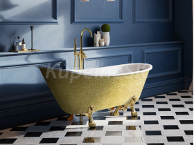 Symetricky oválna voľne stojaca retro vaňa OLAYA Glam sa vyrába s kovovými ozdobnými nohami v štyroch farebných variantoch ( chróm, čierna, biela a zlatá farba) . Krásna masívna vaňa z prvotriedneho sanitárneho kompozitu (akrylátu). Čelná strana je vykonaná vo GLAM01 zlatej farbe , horná a vnútorná časť vane v bielej farbe . Konštrukcia vane nevyžaduje obklad ani obmurovanie. Proti mramorovým vaniam má nižšiu hmotnosť a ľahko sa s ňou manipuluje . Vaňa sa štandardne dodáva bez sifónu . K vani je možné dokúpiť retro sifóny ( s prepadom a bez prepadu ) v troch farebných prevedeniach ( chróm, čierna farba a zlatá farba ). Pre potreby výroby (počet otvorov vo vani) je potrebné pri objednávke špecifikovať , aký druh sifónu bude použiť: s prepadom/bez prepadu.