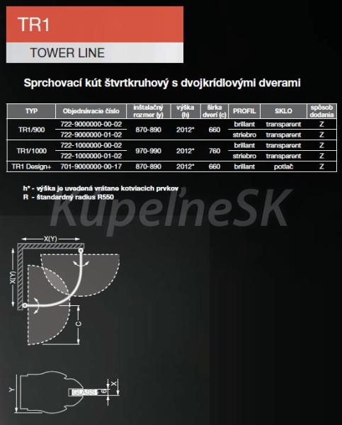 Roltechnik TR1 100x100cm štvrťkruhový sprchový kút, výška 200cm, dvojkrídlové dvere, obojstranné otváranie, rádius 55cm, profil Brillant (leštený hliník), výplň 6mm transparentné kalené bezpečnostné sklo s povrchom Nanoglass.
