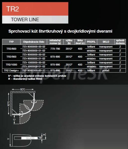 Roltechnik TR2 80x80cm štvrťkruhový sprchový kút, výška 200cm, dvojkrídlové dvere s pevným dielom, obojstranné otváranie, rádius 55cm, profil Brillant (leštený hliník), výplň 6mm transparentné kalené bezpečnostné sklo s povrchom Nanoglass.