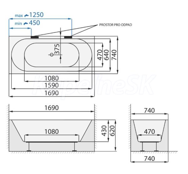 Vzhľadom k užšiemu okraji vane odporúčame objednať odtokový komplet CLICK-CLACK. V prípade požiadavky na odtokový komplet s napúšťaním je nutné zvoliť takú výpust, ktorá nebude presahovať vonkajší rozmer vane, napr. SILFRA, GROHE TALENTOFIL