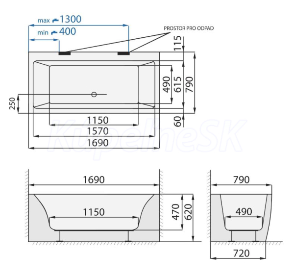 Voľne stojaca vaňa do priestoru TIME MILO R - NIKA sa napája na odpad pomocou flexi odpadovej hadice HT DN 50.