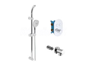 Špeciálne navrhnutá kolekcia termostatických batérií. Ich unikátnosť spočíva predovšetkým v možnosti nastavenia si presnej teploty výstupnej vody, ktorá sa nemení ani pri prerušení sprchovania. Tým šetrí nielen vodu, ale aj enegie a náklady na ohrev. Teplotu vody možno nastaviť bez akýchkoľvek prekážok až do 38 ° C. Pre nastavenie vyššej teploty je nutné stlačiť poistku, ktorá nedovolí deťom zvýšiť teplotu vody a chráni ich tak pred oparením. Výhodou je tiež nízka hlučnosť a kartuša s dlhou životnosťou. V batérii je nastavený maximálny prietok vody, bez možnosti ďalšej regulácie. Dvojcestná varianta (prepínanie dvoch polôh tlačidlom) je určená do sprchových kútov s ručnou a hlavovou sprchou alebo k vani s napúšťaním prepadom a možnosti sprchovania. - 5 rokov záruka na batériu - servis vodovodných batérií zaistený v rámci SR a ČR Súčasťou setu je posuvný držiak s tlačidlovú trojpolohovou sprchou, plastovou šedostriebornou hadicou 150 cm a stenový vývod.