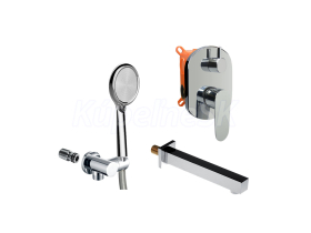 Vaňový set s dvojcestnou podomietkovú batériou s prepínačom, Mbox, oválny kryt, jednopolohová ručná sprcha, plastová šedostrieborná hadica 150 cm, stenový vývod s držiakom, vaňova výtoková hubica. 10 rokov záruka na batériu