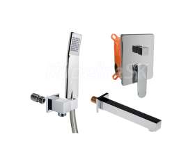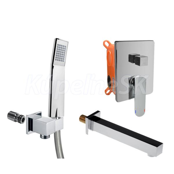 Dvojcestná podomietková batéria s keramickým prepínačom, Mbox, hranatý kryt, vývod s držiakom sprchy, šedostrieborná hadica 150 cm, jednopolohová ručná sprcha, vaňové napúšťací ramienko. 10 rokov záruka na batériu.