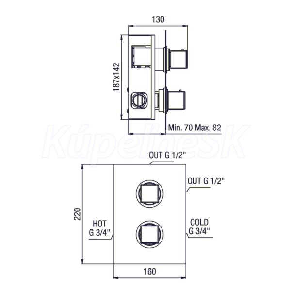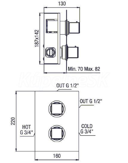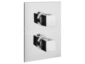 Podomietková sprchová termostatická batéria, pre dva výstupy Podomietková termostatická sprchová batéria pre 2 výstupy. Možnosť napojenia napr. Ručnej a hlavovej sprchy, alebo hlavovej sprchy a nástenných spŕšok. Prepínač vody integrovaný do ovládacej rukoväte. SECUREstop - bezpečný systém proti obareniu. Súčasťou batérie je podomietkové teleso. Balenie neobsahuje ručnú sprchu a hadicu. Batéria je továrňou nastavená a odskúšaná pri tlaku 3 bary na oboch vstupoch. Za týchto podmienok je funkčnosť batérie optimálny s ,akýmkoľvek typom ohrevu vody. Pri tlaku nad 5 barov odporúčame inštaláciu redukčného ventilu. Prípadný servisný zákrok možno jednoducho riešiť po odobratí tenkej krycej dosky. Výmenu termostatické kartuše CR-107c alebo kartuše s ,integrovaným prepínačom CR010NC vykonáte po sňatí rukoväťou. Podomietková batéria ponúka dizajnovo čisté riešenie sprchovacieho kúta. Odporúčame ju aj do menších priestorov, jej malá hĺbka neobmedzuje pohyb osoby v ,sprchovacom kúte.