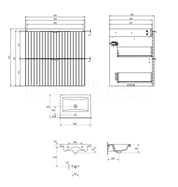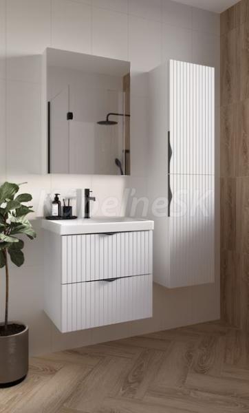 Skrinka je vyrobená zo 16 mm drevotrieskovej dosky a je vybavená dvoma priestrannými zásuvkami s tichým systémom zatvárania. Čelá zásuviek sú frézované a skrinku môžete doplniť oceľovými úchytkami, ktoré sa dodávajú v chrómovej a matnej čiernej farbe. Keramické umývadlo má otvor na batériu a bezpečnostný prepad.
