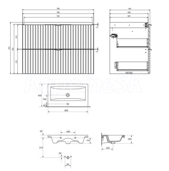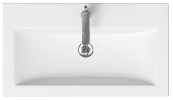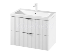 Skrinka je vyrobená zo 16 mm drevotrieskovej dosky a je vybavená dvoma priestrannými zásuvkami s tichým systémom zatvárania. Čelá zásuviek sú frézované a skrinku môžete doplniť oceľovými úchytkami, ktoré sa dodávajú v chrómovej a matnej čiernej farbe. Keramické umývadlo má otvor na batériu a bezpečnostný prepad.