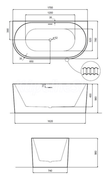 - 170 × 78 x 58 cm, objem 283 l, hmotnosť prázdnej vane 64 kg
