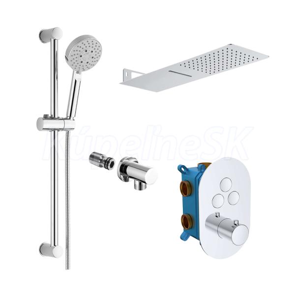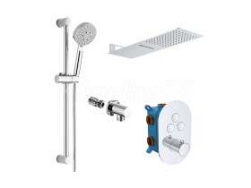 Špeciálne navrhnutá kolekcia termostatických batérií. Ich unikátnosť spočíva predovšetkým v možnosti nastavenia si presnej teploty výstupnej vody, ktorá sa nemení ani pri prerušení sprchovania. Tým šetrí nielen vodu, ale aj energiu a náklady na ohrev. Teplotu vody je možné nastaviť bez akýchkoľvek prekážok až do 38 oC. Pre nastavenie vyššej teploty je nutné stlačiť poistku, ktorá nedovolí deťom zvýšiť teplotu vody a chráni ich tak pred obarením. Výhodou je aj nízka hlučnosť a kartuše s dlhou životnosťou. V batérii je nastavený maximálny prietok vody, bez možnosti ďalšej regulácie. Trojcestná varianta (s prepínačom 3 polohy) je určená do sprchových kútov s ručnou sprchou, hlavovou sprchou a ďalším zdrojom tečúcej vody, napr. vodopádom. - keramická kartuša 35 mm - 10 rokov záruka na batériu - servis vodovodných batérií zaistený v rámci SR a ČR Súčasťou setu je tanierová sprcha s vodopádom 500x200 mm, posuvný držiak, päťpolohová sprcha, nerezová hadica so systémom zabraňujúcim prekrúteniu, 150 cm, stenový vývod.