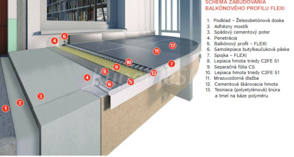 Balkónový profil - FLEXIje jedinečný profil na trhu s balkónovými profilmi na ukončovanie balkónov a terás oblúkového tvaru s pokládku na hotový spádový poter. Výška ukončovacej hrany je 10 mm. Je vhodný pre konštrukčné skladby s jedno alebo dvojzložkovou elastickou hydroizoláciou, prípadne separačnou fóliou CS. Profil je možné ohnúť na požadovaný rádius pomocou špeciálnej skružovačky. Pomocou uzatvorenej hrany získame čisté a dokonalé ukončenie dlažby oblúkového tvaru. Profil je možné kombinovať s balkónovým profilom PRIAMY. Viac o realizovaných projektoch na www.celox.sk v sekcii balkónový profil FLEXI.
