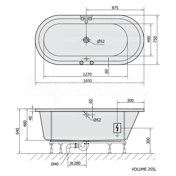 Polysan ASTRA O hydromasážna vaňa, 165x75x48cm, Active Hydro, Biela,krytka Chróm