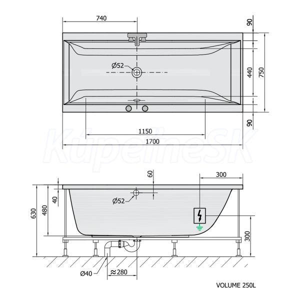 Polysan CLEO hydromasážna vaňa, 170x75x48cm, Highline Hydro, Biela,krytka Chróm