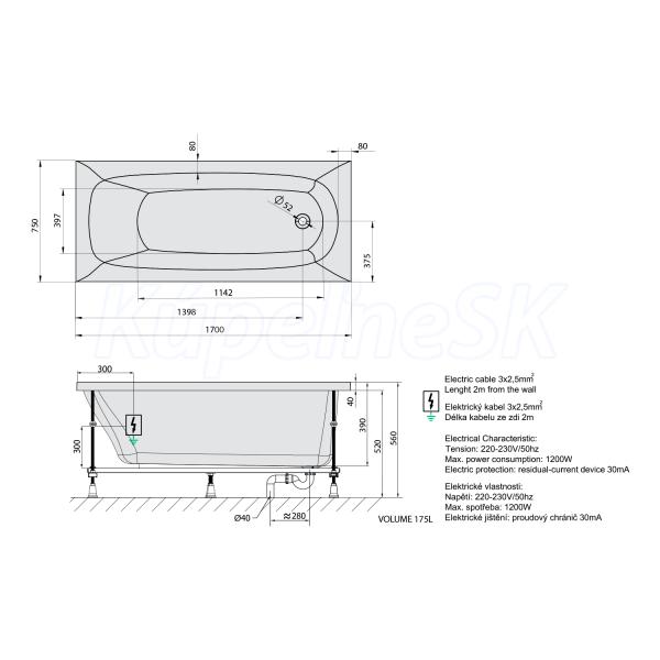 Polysan EBRO hydromasážna vaňa, 170x75x39cm, Highline Hydro, Biela,krytka Chróm