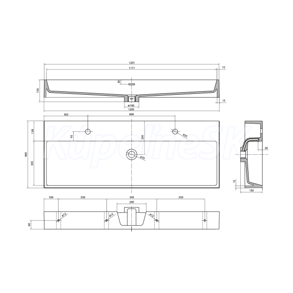 Sapho AQUATIC umývadlo, liaty mramor, 120x46cm, 2 otvory pre batérie, biela