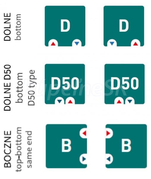 - Spodná: 770 mm, 970 mm, 1170 mm, 1370 mm, 1570 mm, 1770 mm (na spodných stranách radiátora)