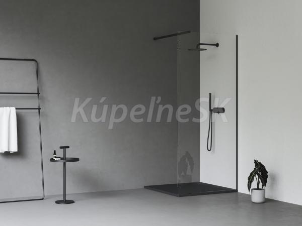 Sprchový kút Walk-In Wall s otvoreným vstupom z jednej strany. V čiernom vyhotovení a s výplňou z číreho skla s ochrannou vrstvou Ravak AntiCalc. Výrobok je zložený z pevnej steny a kovových častí.