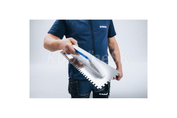 hladítko nerez zubové 480 x 130 mm ergonomická, trojsložková plastová rukojeť typu "soft" (G-21) nerezový, kyselině odolný plech tl. 0,7 mm slouží k nanášení lepidel pod obklady a dlažby, stěrek, štuků, omítek, tmelů a dalších stavebních hmot