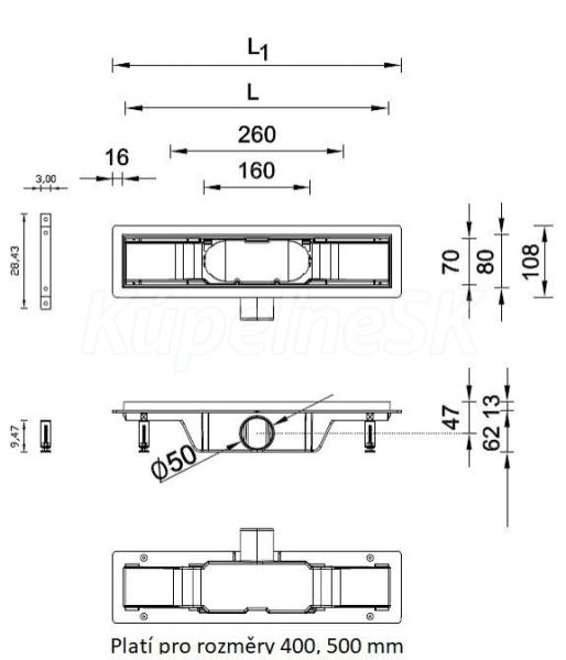 Odtokový žľab KLASSZIK - 500: ROZMER A roštu 50 cm, dĺžka žľabu 53 cm (možnosť vloženia dlažby)