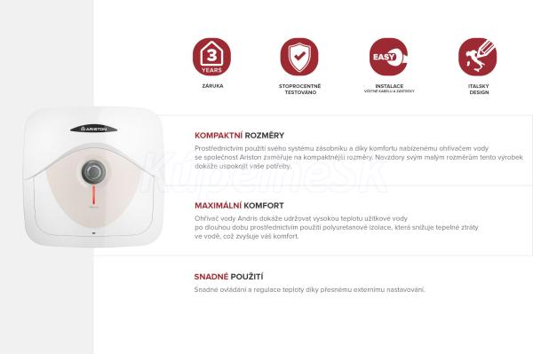Ariston DUNE RS 10 1,5K PL EU, kód 3100852, Ohrievače vody | Elektrické ohrievače vody | Tlakové ohrievače vody | 10 litrov Bojler - objem 10 l, príkon 1500 W, nad miestom použitia, medené vykurovacie teleso, rozmery 36 × 36 × 27,6 cm (V × Š × H), horčíková anóda, termostat, ochrana proti legionelám a ochrana proti zamrznutiu