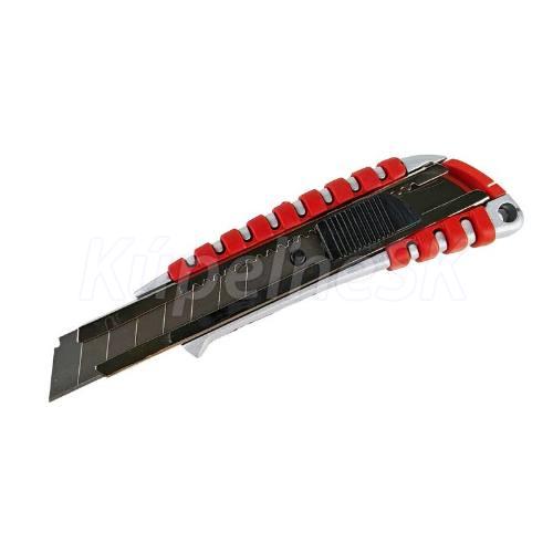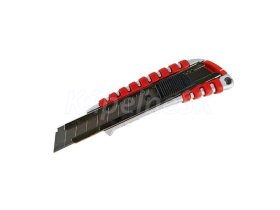 celokovové telo noža protišmyková rukoväť s plastovými výstupkami kovová vodiaca lišta automatická posuvná aretácia šírka čepele 18 mm do noža možno umiestniť až 2 náhradné čepele blister náhradné brity kód: