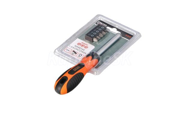 praktická sada skrutkovačov s 5 nástavcami jednoduchá výmena vyrobené z CrV ocele ergonomická protišmyková rukoväť koncový bit 1/4 " sada obsahuje ploché a PH bity: Ph1, Ph2, Pz1, Pz2; 4-5 mm