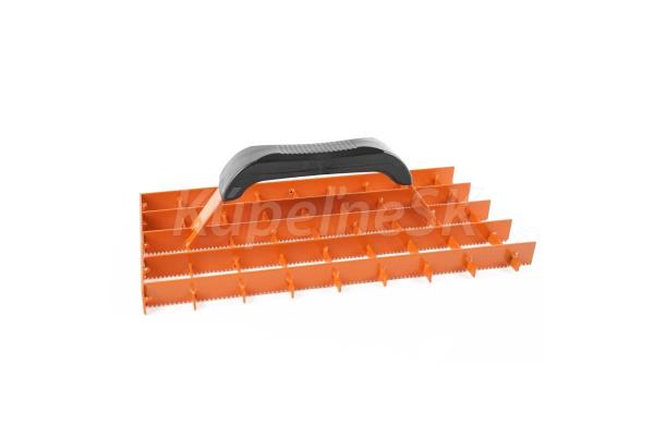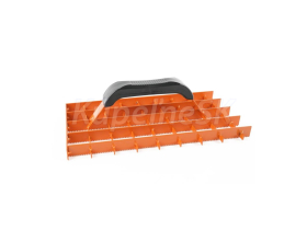 ocelový ozubený škrabák omítek, ENPRO rukojeť pokrytá plastem určen na vyrovnání vápenných a sádrových omítek rozměry: 280 x 140 mm barva: oranžová