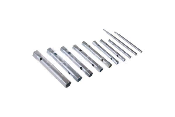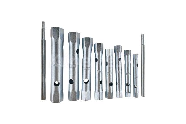 rúrkové kľúče - sada 8ks + 2ks pák rôznych dĺžok vyrobené z ušľachtilej CrV ocele rozmery kľúčov: 6x7; 8x9; 10x11; 12x13; 14x15; 16x17; 18x19; 20x22 mm kľúče vhodné na prácu s dlhými závitmi a pod. veľkosti jednotlivých kľúčov sú nasledovné