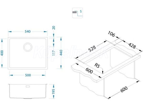 Alveus KOMBINO 50 MONARCH ANTHRACITE F/S Drez so spodnou motnážou, univerzál. Prevedenie: Monarch Vonkajší rozmer: 540x440 mm Rozmer vaničky: 500x400x195 mm Excentrický sitkový ventil 3 1/2 s prepadom, sifón na úsporu miesta s odbočkou na umývačku. Úchyty a tesnenia na upevnenie drezu v balení Bez otvoru pre batériu Návod na inštaláciu v obrázkoch na obale Inštalácia do skrinky so šírkou 600 mm Dřez se spodní motnáží, univerzál. Provedení : Monarch Vnější rozměr: 540x440 mm Rozměr vaničky: 500x400x195 mm Excentrický sítkový ventil 3 1/2 s přepadem, sifon pro úsporu místa s odbočkou na myčku. Úchyty a těsnění pro upevnění dřezu v balení Bez otvoru pro baterii Návod pro instalaci v obrázcích na obale Instalace do skříňky o šířce 600 mm