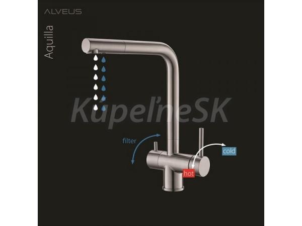Alveus BATERIE AQUILA - SAT Tato baterie je navržena pro připojení k vodnímu filtru, přes který může být voda očištěna od všech nečistot, které zhoršují kvalitu a chuť pitné vody. Pravá páka umožňuje použití studené a teplé vody pro běžné domácí využití, levá páka poskytuje čerstvou, čistou vodu k pití.