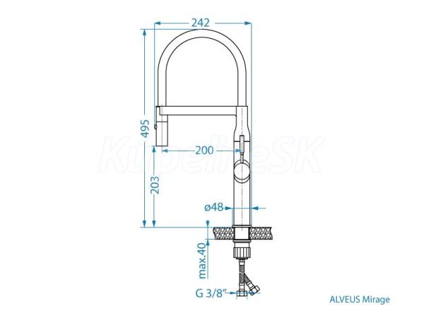 Alveus BATERIE MIRAGE-PS BLACK MATT Typ: Kuchyňská stojánková baterie Rozměr: 242x495 mm Design: Obloukový tvar s vysokým výtokem pro pohodlné používání Ovládání: Jednopáková, pro snadné míchání teploty a průtoku vody Materiál: Mosaz s vysoce odolnou povrchovou úpravou Otočný výtok: 360° Montáž: Standardní otvor 35 mm Připojení: Flexi hadičky 3/8"