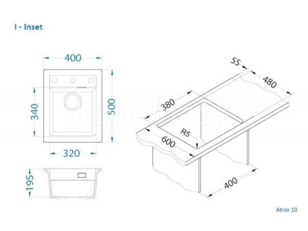 Alveus ATROX 10 písek 22 + pop up sifon Vonkajší rozmer: 470 x 500 mm Rozmer vaničky: 390 x 340 x 195 mm Exentrický sitkový ventil 3 1/2 s prepadom, sifón pre úsporu miesta s odbočkou na umývačku Úchyty a tesnenia na upevnenie drezu v balení S otvorom pre batériu Predfrézované dva otvory Návod na inštaláciu v obrázkoch na obale Inštalácia do skrinky pri montáži: I- o šírke 450 mm, U- o šírke 600 mm Váha: 12,5 kg Rozmer balenia (mm): 598x584x263 Vestavěný dřez, univerzál. Provedení : granitový dřez bez odkapu Vnější rozměr: 400 x 500 mm Rozměr vaničky: 320 x 340 x 195 mm Exentrický sítkový ventil 3 1/2 s přepadem, sifon pro úsporu místa s odbočkou na myčku Úchyty a těsnění pro upevnění dřezu v balení S otvorem pro baterii Předfrézované dva otvory Návod pro instalaci v obrázcích na obale Instalace do skříňky při montáži: I- o šířce 450 mm, U- o šířce 600 mm Váha: 12,5 kg Rozměr balení (mm): 598x584x263