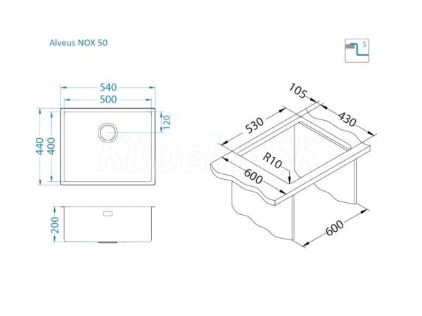 Alveus NOX 50 F/S/U BRS 540x440 MATERIÁL: BRS ROZMERY: 540x440x200 Šírka skrinky Montáž F/S 600mm Šírka skrinky Montáž U 800mm MATERIÁL: BRS ROZMĚRY: 540x440x200 Šířka skříňky Montáž F/S 600mm Šířka skříňky Montáž U 800mm