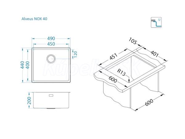Alveus NOX 40 F/S/U BRS 490x440 MATERIÁL: BRS ROZMERY: 490x440x200 Šírka skrinky Montáž F/S 500mm Šírka skrinky Montáž U 600mm MATERIÁL: BRS ROZMĚRY: 490x440x200 Šířka skříňky Montáž F/S 500mm Šířka skříňky Montáž U 600mm
