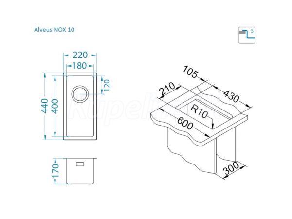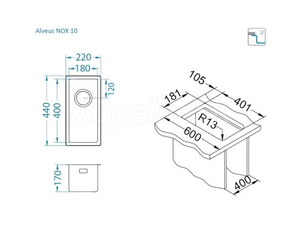 >>  KUCHYNE - Kuchynský tovar  >>  Kuchynské drezy  >>  Drezy spodná montáž a do roviny  >>  Alveus NOX 10 F/S/U BRS vstavaný nerez drez 220x440x170 mm Kartáčovaný Nerez