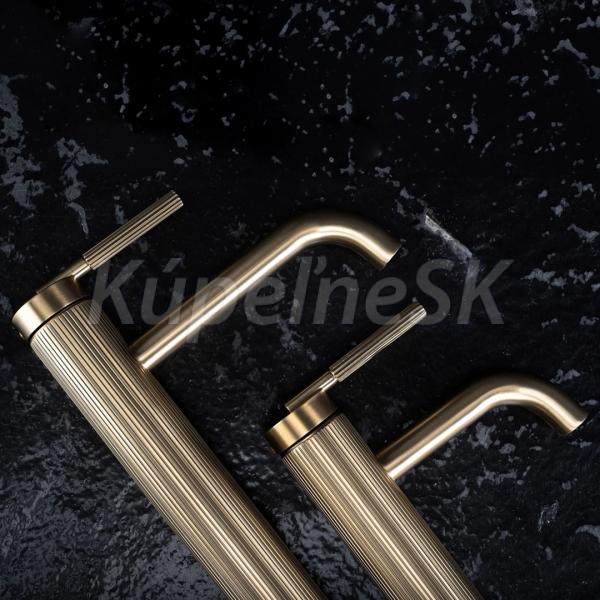 Elegantná vaňová batéria Agron v zlatom brúsenom vzhľade vyniká moderným, minimalistickým dizajnom s jemnými ryhovaniami na tele, čím jej dodáva výnimočný charakter. Vyrobená z vysoko kvalitnej mosadze, zaručuje odolnosť.