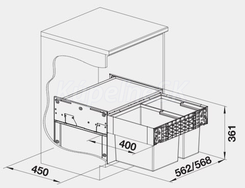 Výška zabudovania 361 mm, hĺbka zabudovania 400 mm, nutný vnútorný rozmer pre pojazdy 450 mm.
