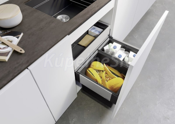voliteľne dostupné: praktické príslušenstvo ako veko na nádoby, SELECT clip držiak pre vrecia na odpadky, elektrický otvárací systém BLANCO SELECT AutoMove alebo nožný výsuv BLANCO MOVEX