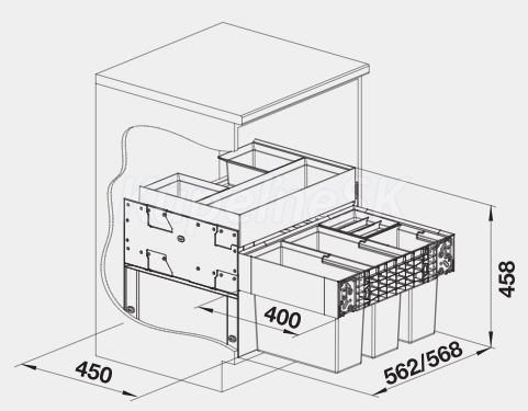 Výška zabudovania 361 mm, hĺbka zabudovania 400 mm, nutný vnútorný rozmer pre pojazdy 450 mm.